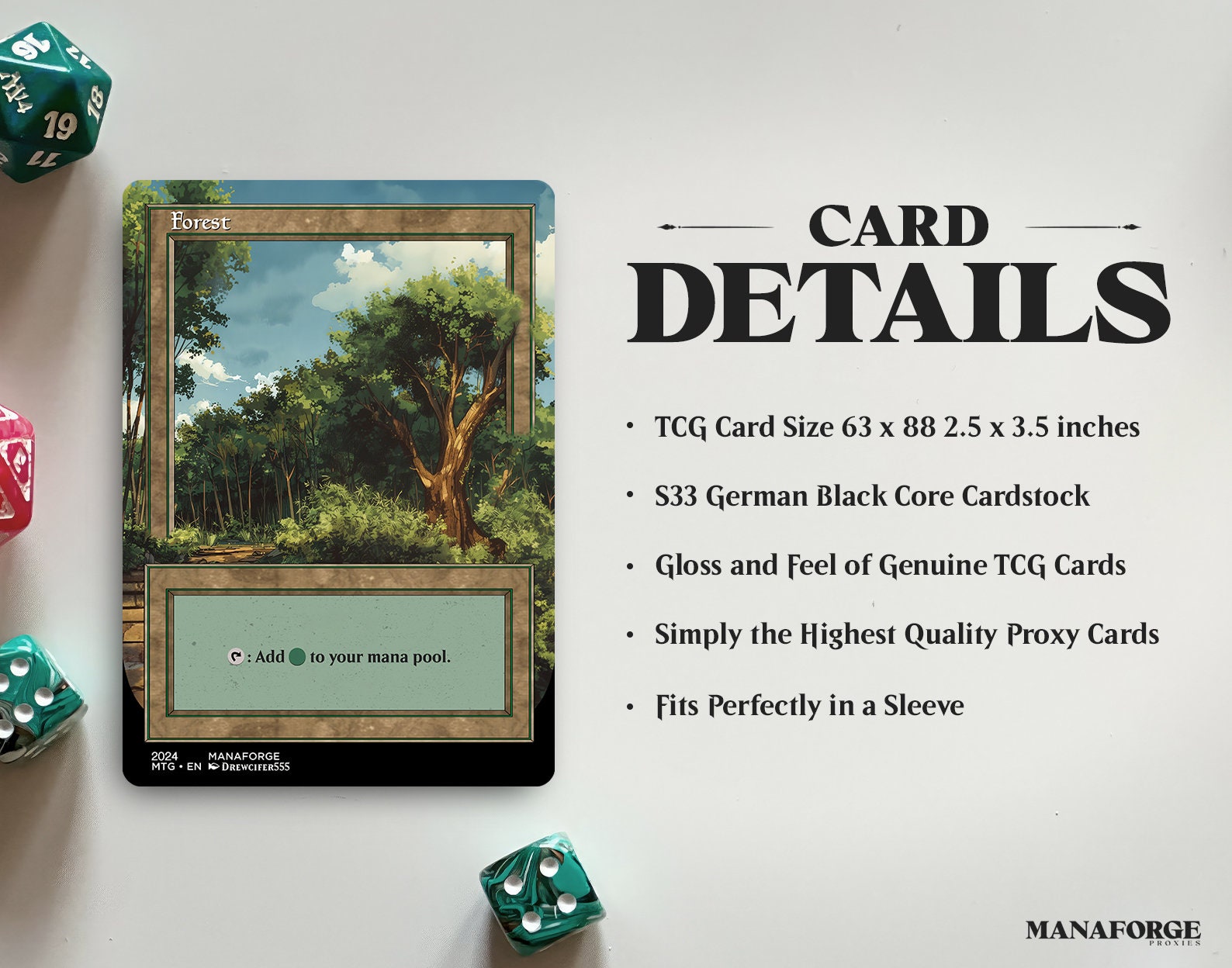 Step into nostalgia with the Modern Retro Basic Lands Set - Full Art MTG Proxies, Volume One. Blending classic Magic the Gathering card frames with a sleek modern design, this set includes 4x Islands, Mountains, Swamps, Plains, and Forests. Perfect for Commander and casual play, these retro-themed proxies add sophistication and class to your collection, while capturing the essence of old-school MTG with a fresh twist.