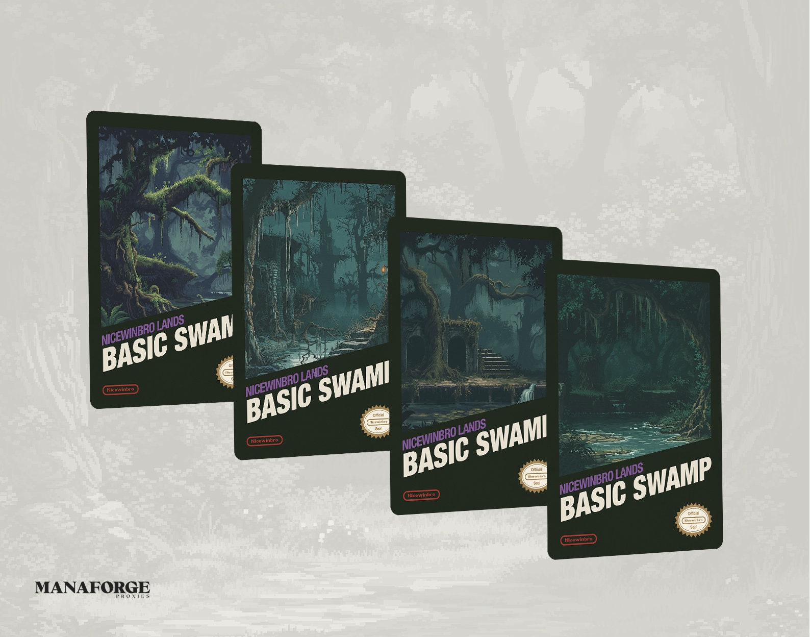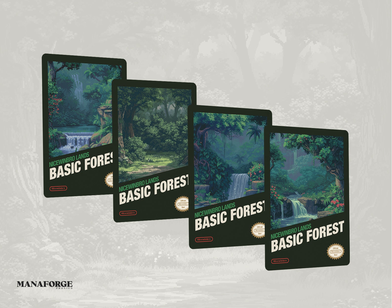Teleport back to the golden era of gaming with the Retro NES Nicewinbro Basic Lands Set, Volume One! Featuring 4x Islands, Mountains, Swamps, Plains, and Forests, this set pays homage to classic NES box art with a pixelated, 8-bit inspired design. Perfect for Commander and casual MTG play, these custom artwork proxies inject a vintage, nostalgic edge into your deck, blending the magic of retro gaming with Magic: The Gathering.