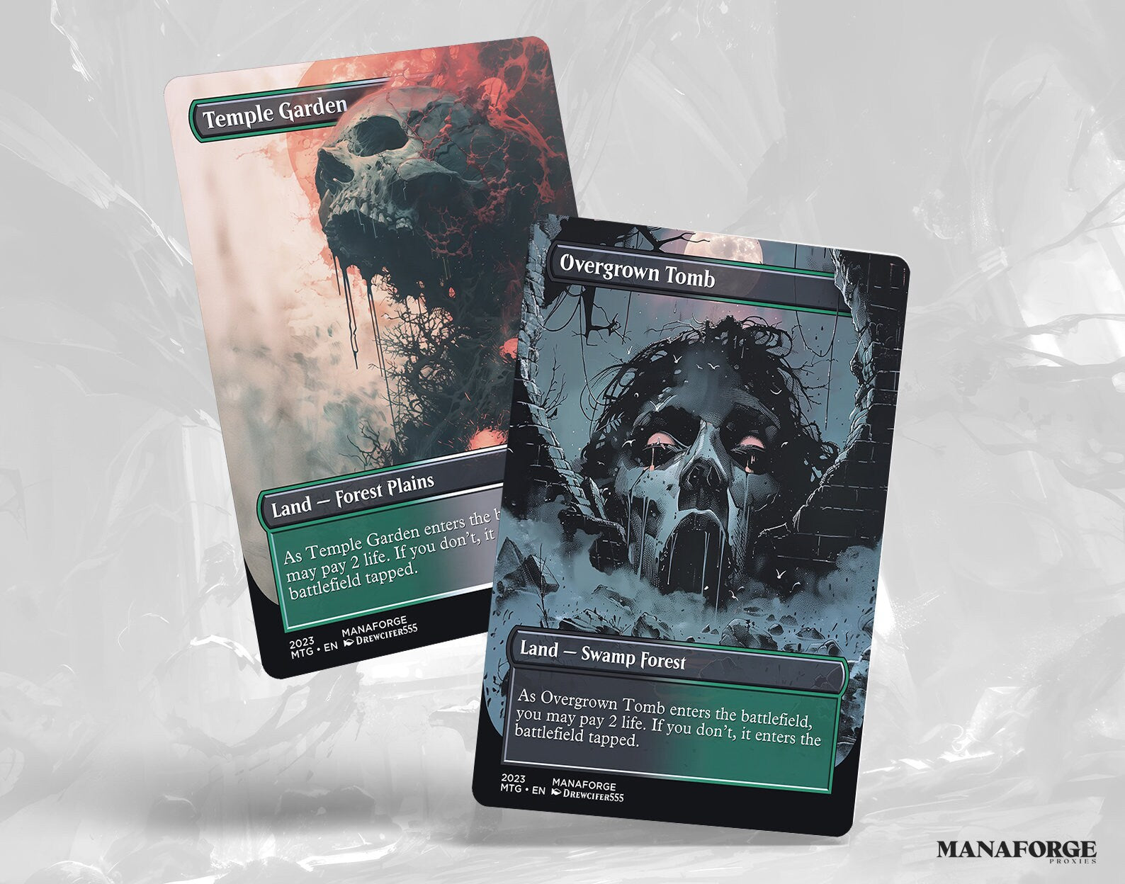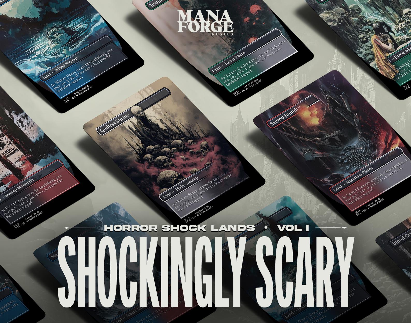 Dive into the dark with our "Shockingly Scary" bundle, featuring ten shock lands with custom horror artwork designed to send shivers down your spine. This collection combines the strategic power of shock lands with the eerie allure of meticulously crafted horror themes, perfect for spicing up your Commander decks and other formats.